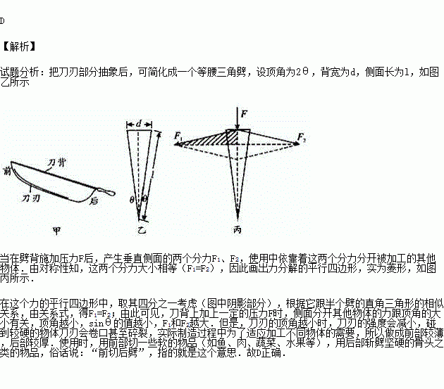 假期里,一位同学在厨房里协助妈妈做菜,对菜刀发生了兴趣.他发现菜刀的刀刃前部和后部的厚薄不一样,刀刃前部的顶角小,后部的顶角大(如图所示),他先后做出过几个猜想,其中合理的是( )
