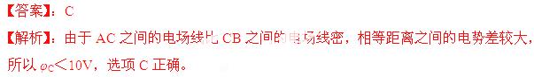 (湖北省荆门市2012-2013学年度高三元月调考)如图所示,在某电场中画出了三条电场线,C点是A、B连线的中点。已知A点的电势为φA=30V,B点的电势为φB=-10V,则C点的电势