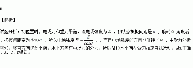 如图所示,两平行金属板水平放置并接到电源上,一个带电微粒P位于两板间,恰好平衡.现用外力将P固定住,然后固定导线各接点,使两板均转过α角,如图虚线所示,再撤去外力,则P在两板间( )