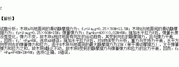 木块A、B的最大静摩擦力分别是12.5N和15N,夹在A、B的轻弹簧被压缩了2cm,弹簧的劲度系数为400N/m,系统置于水平地面不动,先用F=1N的力水平向右作用在B上,力F作用后( )