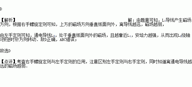 通有电流的导线L1、L2处在同一平面(纸面)内,L1是固定的,L2可绕垂直纸面的固定转轴O转动(O为L2的中心),各自的电流方向如图所示.下列哪种情况将会发生( )