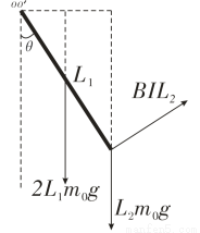 如图,在匀强磁场中,单位长度质量为m0的“U型”金属导线可绕水平轴OO′转动,ab边长为L1,bc边长为L2。若导线中通以沿abcd方向的电流I,导线保持静止并与竖直方向夹角为θ,则磁场的磁感应强度至少为 ,此时方向为 。