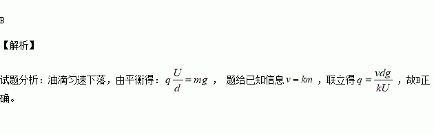 美国物理学家密立根(R.A.Millikan)于20世纪初进行了多次实验,比较准确的测定了电子的电荷量,其实验原理可以简化为如下模型:两个相距为d的平行金属板A、B水平放置,两板接有可调电源。从A板上的小孔进入两板间的油滴因摩擦而带有一定的电荷量,将两板间的电势差调节到U时,带电油滴恰好悬浮在两板间;然后撤去电场,油滴开始下落,由于空气阻力,下落的油滴很快达到匀速下落状态,通过显微镜观测这个速度的大小为v,已知这个速度与油滴的质量成正比,比例系数为k,重力加速度为g。则计算油滴带电荷量的表达式为