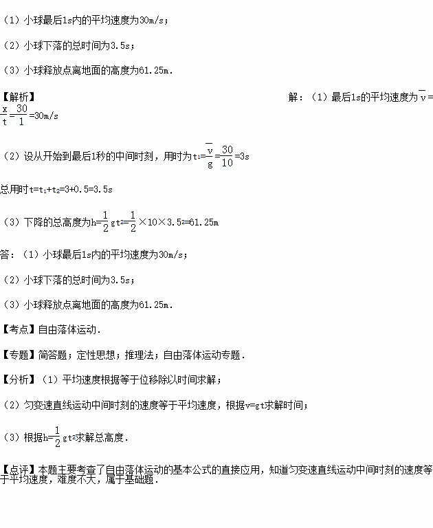 从某一高度静止释放一个小球,已知最后1s内小球的位移为30m,不计空气阻力,g=10m/s2,试求: