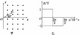 如图13甲所示,在y轴右侧加有垂直纸面向外的匀强磁场,磁感应强度B=1 T。从原点O处向第Ⅰ象限发射一比荷