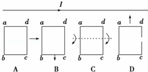 线圈在长直导线电流的磁场中,做如图所示的运动:A向右平动,B向下平动,C绕轴转动(ad边向外转动角度θ≤90°),D向上平动(D线圈有个缺口),判断线圈中有感应电流的是( )