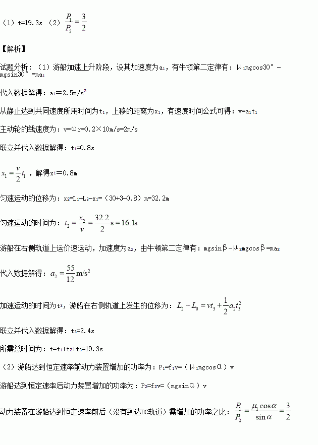 激流勇进是游乐园常有的机动游乐项目。其工作原理是由主动轮将游船沿较长的倾斜轨道提升至一定高度,然后船只从高处滑下,冲入水中,溅起很高且美丽的水花,整个过程刺激又有趣。其工作过程可以简化为如下情景:如图所示,左侧倾角α=30°的轨道AB(其长L1= 30m)上相互间隔安装着主动轮,主动轮与游船间的动摩擦因数