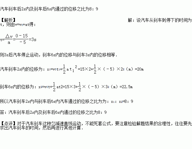 汽车以15m/s的速度做匀速直线运动,见前方有障碍物立即刹车,刹车的加速度大小为5m/s2,则汽车刹车后2s内及刹车后6s内通过的位移之比为多少?