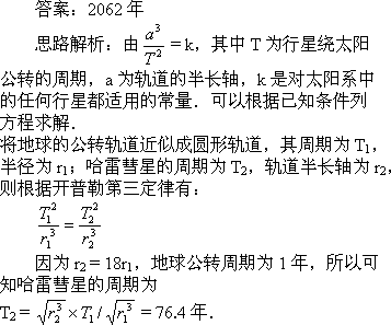 µØÇòµÄ¹«×ª¹ìµÀ½Ó½üÔ²£¬µ«åçÐǵÄÔ˶¯¹ìµÀÔòÊÇÒ»¸ö·Ç³£±âµÄÍÖÔ²£®ÌìÎÄѧ¼Ò¹þÀ×Ôø¾ÔÚ1682Äê¸ú×Ù¹ýÒ»¿ÅåçÐÇ£¬ËûËã³öÕâ¿ÅåçÐǹìµÀµÄ°ë³¤ÖáÔ¼µÈÓÚµØÇò¹«×ª°ë¾¶µÄ18±¶£¬²¢Ô¤ÑÔÕâ¿ÅåçÐǽ«Ã¿¸ôÒ»¶¨Ê±¼ä¾Í»á³öÏÖ£®¹þÀ×µÄÔ¤ÑԵõ½Ö¤Êµ£¬¸ÃåçÐDZ»ÃüÃûΪ¹þÀ×åçÐÇ£®¹þÀ×åçÐÇ×î½ü³öÏÖµÄʱ¼äÊÇ1986Ä꣬ÇëÄã¸ù¾Ý¿ªÆÕÀÕÐÐÐÇÔ˶¯µÚÈý¶¨ÂÉ(¼´