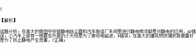 A.在高大的烟囱中安装静电除尘器 B.小汽车上装有一根露在外面的小天线