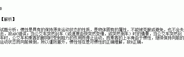 为提醒乘客注意,公交公司征集到几条友情提示语,其中对惯性的理解正确的是( )