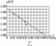 由闭合电路欧姆定律得U=E﹣Ir,U﹣I成线性关系, 图线的纵轴截距表示电动势, 所以E=1.45 V 斜率的绝对值表示内阻, r= 故答案为:(1)如甲图 (2)如乙图,1.45,0.69 |