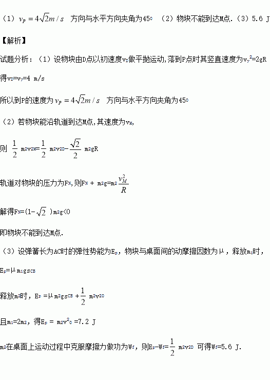 如图所示,水平桌面上有一轻弹簧,左端固定在A点,自然状态时其右端位于B点。水平桌面右侧有一竖直放置的光滑轨道MNP,其形状为半径R=0.8 m的圆环剪去了左上角的1350的圆弧,MN为其竖直直径,P点到桌面的竖直距离也是R。用质量m1=0.4 kg的物块将弹簧缓慢压缩到C点,释放后弹簧恢复原长时物块恰停止在B点。用同种材料?质量为m2=0.2 kg的物块将弹簧缓慢压缩到C点释放,物块过B点后其位移与时间的关系为x=6t-2t2,物块飞离桌面后由P点沿切线落入圆轨道,不计空气阻力,g=10 m/s2,求: