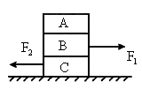 如图所示,A、B、C三个物体,叠放在水平地面上,B和C各受到5N的水平拉力