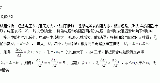 如图,电路中定值电阻阻值R大于电源内阻阻值r。将滑动变阻器滑片向下滑动,理想电压表V1、V2、V3示数变化量的绝对值分别为△V1、△V2、△V3,理想电流表