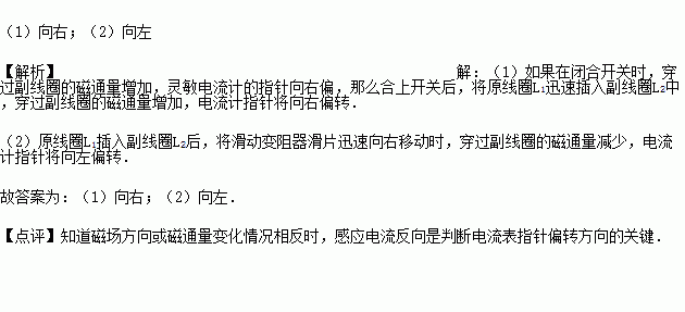 (2)原线圈L1插入副线圈L2后,将滑动变阻器滑片迅速向右移动时,电流计指针将 偏转.(填“向左”“向右”或“不”)