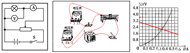 图象中将(0,3V)与(0.6A .1.5V )两点用直线连接如图所示,由图可知两图线的交点坐标为U=2.1V,I=0.35A,则小灯泡的功率为P=UI=2.1×0.35W≈0.735W.