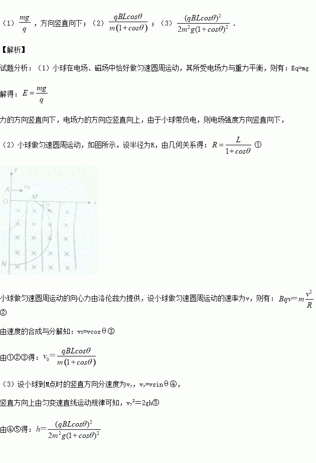 ÈçͼËùʾ£¬Ö±½Ç×ø±êϵxOyλÓÚÊúÖ±Æ½ÃæÄÚ£¬ÔÚµÚËÄÏóÏÞ´æÔÚÔÈÇ¿´Å³¡ºÍÔÈÇ¿µç³¡£¬´Å³¡µÄ´Å¸ÐӦǿ¶ÈΪB£¬·½Ïò´¹Ö±xOyÆ½ÃæÏòÀµç³¡Ï߯½ÐÐÓÚyÖᣬһÖÊÁ¿Îªm£¬µçºÉÁ¿´óСΪqµÄ´ø¸ºµçµÄСÇò£¬´ÓyÖáÉϵÄAµãˮƽÏòÓÒÅ׳ö£¬¾xÖáÉϵÄMµã½øÈëµç³¡ºÍ´Å³¡£¬Ç¡ÄÜ×öÔÈËÙÔ²ÖÜÔ˶¯£¬×îºó´ÓyÖáÉϵÄNµãÑØ´¹Ö±ÓÚyÖáµÄ·½ÏòÀ뿪µç³¡ºÍ´Å³¡£¬ONÖ®¼äµÄ¾àÀëΪL£®Ð¡Çò¹ýMµãʱËÙ¶È·½ÏòÓëxÖáÕý·½Ïò¼Ð½ÇΪ¦È£¬²»¼Æ¿ÕÆø×èÁ¦£¬ÖØÁ¦¼ÓËÙ¶ÈΪg£¬Çó£º