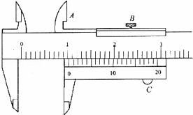 用游标卡尺测量某小球直径时,为使测量爪靠近小球,应用手指推动部件(如图中“A”、“B”、“C”),并旋紧紧固螺丝再进行读数.如图是卡尺的某次测量其读数为 10.30 mm.