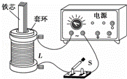 物理课上,老师做了一个奇妙的“跳环实验”.如图所示,她把一个带铁芯的线圈L开关S和电源用导线连接起来后,将一金属套环置于线圈L上,且使铁芯穿过套环,闭合开关S的瞬间,套环立刻跳起.某同学另找来器材再探究此实验.他连接好电路,经重复试验,线圈上的套环均未动.对比老师演示的实验,下列四个选项中,导致套环未动的原因可能是( )