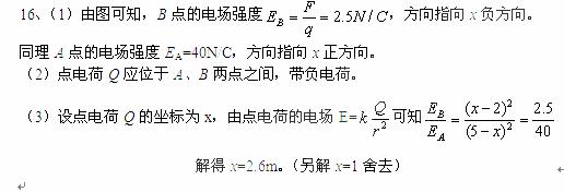 (12分)如图16所示,在一个点电荷Q的电场中,Ox坐标轴与它的一条电场线重合,坐标轴上A、B两点的坐标分别为2.0m和5.0m。放在A、B两点的试探电荷受到的电场力方向都跟x轴的正方向相同,电场力的大小跟试探电荷所带电量的关系图象如图中直线a、b所示,放在A点的电荷带正电,放在B点的电荷带负电。求:![]()