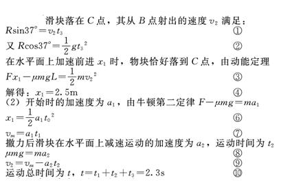 如图所示,水平地面的B点右侧有一圆形挡板。圆的半径R=4m,B为圆心,BC连线与竖直方向夹角为37o.滑块静止在水平地面上的A点,AB间距L=4.5m.现用水平拉力F=18N沿AB方向拉滑块,持续作用一段距离后撤去,滑块恰好落在圆形挡板的C点,已知滑块质量辨=2kg,与水平面间的动摩擦因数