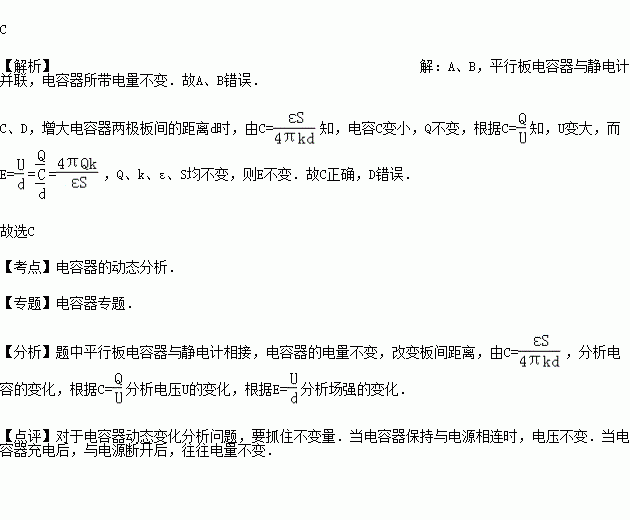 如图所示的实验装置中,极板A接地,平行板电容器的极板B与一个灵敏的静电计相接.将A极板向左移动,增大电容器两极板间的距离时,电容器所带的电量Q、电容C、两极间的电压U,电容器两极板间的场强E的变化情况是( )