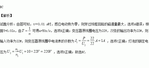 (多选)如图甲所示,矩形金属线框绕与磁感线垂直的转轴在匀强磁场中匀速转动,输出交变电流的电压图象如图乙所示,经原、副线圈匝数比为1∶10的理想变压器给一灯泡供电,如图丙所示,副线圈电路中灯泡的额定功率为22 W,现闭合开关,灯泡正常发光.则 ( )