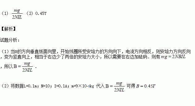 (2)当L=0.1m; N=10; I=0.1A;m=9×10-3kg时磁感应强度是多少?