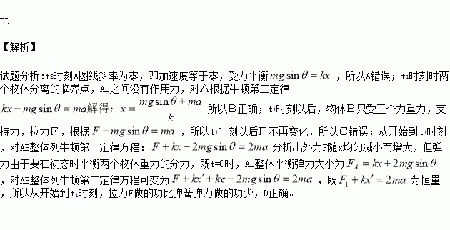 如图甲所示,平行于光滑斜面的轻弹簧劲度系数为k,一端固定在倾角为θ的斜面底端,另一端与物块A连接;两物块A、B质量均为m,初始时均静止.现用平行于斜面向上的力F拉动物块B,使B做加速度为a的匀加速运动,A、B两物块在开始一段时间内的υ﹣t关系分别对应图乙中A、B图线(t1时刻A、B的图线相切,t2时刻对应A图线的最高点),重力加速度为g,则( )