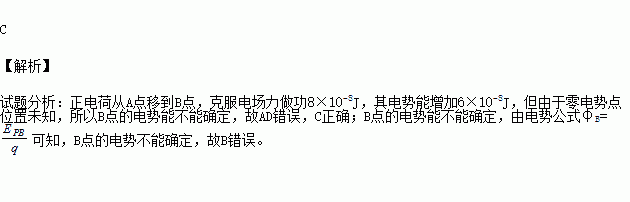 在电场中,把电荷量为4×10﹣9C的正电荷从A点移到B点,克服电场力做功8×10﹣8J,以下说法中正确的是()