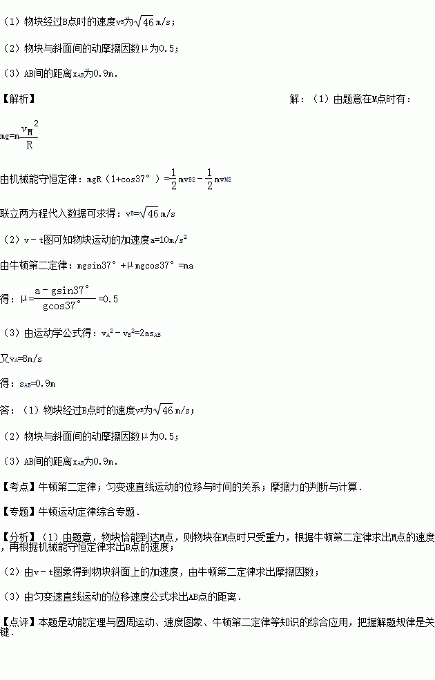 如图甲所示,半径R=1m,圆心角等于143°的竖直圆弧形光滑轨道,与斜面相切于B处,圆弧形轨道的最高点为M,斜面倾角θ=37°,t=0时刻有一物块沿斜面上滑,其在斜面上运动的速度变化规律如图乙所示.若物块恰能到达M点,取g=10m/s2,sin37°=0.6,cos37°=0.8,求: