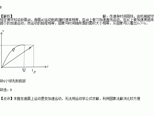 一个固定在水平面上的光滑物块,其左侧面是斜面AB,右侧面是曲面AC,如图所示.已知AB和AC的长度相同.两个小球p、q同时从A点分别沿AB和AC由静止开始下滑,比较它们到达水平面所用的时间( )