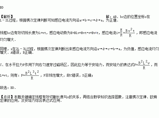 在光滑水平桌面上有一边长为l的正方形线框abcd,bc边右侧有一等腰直角三角形匀强磁场区域efg,三角形腰长为l,磁感应强度竖直向下,a、b、e、f在同一直线上,其俯视图如图所示,线框从图示位置在水平拉力F作用下以速度v向右匀速穿过磁场区,线框中感应电流i﹣t和F﹣t图象正确的是(以逆时针方向为电流的正方向,以水平向右的拉力为正,时间单位为
