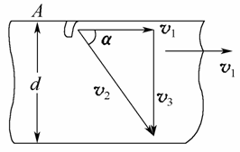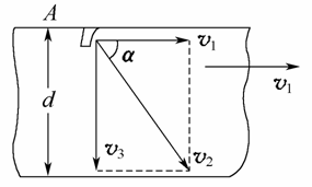 为使割线垂直玻璃两边,就要求割刀A的速度v2在沿v1方向上的分量等于v1,这样割刀A就在v1方向上与玻璃同步了.v2垂直于v1方向的分量v3,即为相对玻璃的切割速度.v2的分解图如图12-9所示.后面的解答过程同解法一.