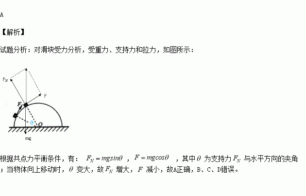 如图,表面光滑的半球体固定在水平面上,O为球心,一小物块在拉力F作用下,缓慢地沿球面向上运动一小段距离,在物块运动过程中F始终沿球面的切线方向,球面对物块的弹力大小用FN表示。在运动过程中