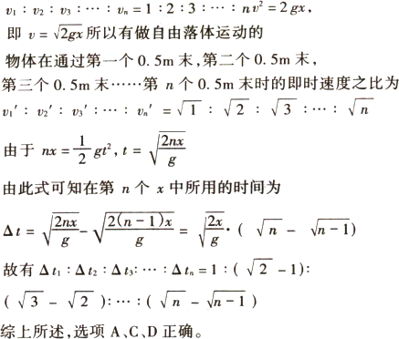 D.做自由落体运动的物体在通过第一个0.5 m内,第二个0.5 m内,第三个0.5 m内……第n个0.5 m内所经历的时间之比是1∶(