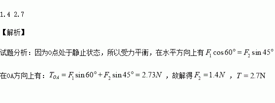 在做《验证力的平行四边形定则》的实验时,在水平放置的木板上垫上一张白纸,把橡皮条的一端固定在板的A点,用两根细绳结在橡皮条的另一端O,如图所示.通过细绳用两个互成角度的测力计拉橡皮条,使结点移到某一位置,拉力F1和F2的方向与OA夹角分别为1500和1350,F1=2N,则F2=_______N,OA线上的拉力为________N.