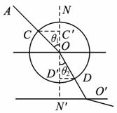 (1)处理方法(Ⅰ):在找到入射光线和折射光线以后,以入射点O为圆心,以任意长为半径画圆,分别与AO交于C点,与OO′(或OO′的延长线)交于D点,过C、D两点分别向NN′作垂线,交NN′于C′、D′,用直尺量出CC′和DD′的长,如答图13-3所示。