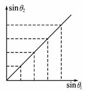 在多次改变入射角、测量相对应的入射角和折射角正弦值基础上,以sinθ1值为横坐标、以sinθ2值为纵坐标,建立直角坐标系,如答图13-4所示。描数据点,过数据点连线得一条过原点的直线。