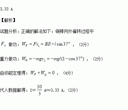 如图所示,质量为0.05 kg、长l=0.1 m的铜棒,用长度也为l的两根轻软导线水平悬吊在竖直向上的匀强磁场中,磁感应强度为B=0.5 T.不通电时,轻线在竖直方向,通入恒定电流后,棒向外偏转的最大角度θ=37°,求此棒中恒定电流多大?(不考虑棒摆动过程中产生的感应电流,g取10 N/kg)