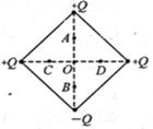 在正方形的四个顶点上分别固定有带电量绝对值均为Q的点电荷,其带点性如图所示。正方形的对角线交点为O,在两条对角线上分别取点A、B、C、D且OA=OB=OC=OD。不计电子重力。则