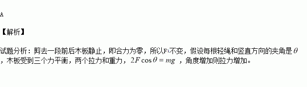 如图,用两根等长轻绳将木板悬挂在竖直木桩上等高的两点,制成一简易秋千。某次维修时将两轻绳各剪去一小段,但仍保持等长且悬挂点不变。木板静止时,F1表示木板所受合力的大小,F2表示单根轻绳对木板拉力的大小,则维修后