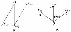 如图5所示,A、B为竖直墙面上等高的两点,AO、BO为长度相等的两根轻绳,CO为轻杆.光滑转轴C在AB中点D的正下方,A、O、B在同一水平面内.∠AOB=120°,∠COD=60°.若在O点处悬挂一个质量为m的物体,则平衡后绳AO所受的拉力和杆CO所受的压力分别为 ( )