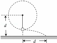 小明手握不可伸长的轻绳一端,另一端系着质量为0.3kg的小球,甩动手腕,使球在竖直平面内做圆周运动.当球某次运动到最低点时,绳恰好达到所能承受的最大拉力F而断掉,球飞行水平距离d=0.5m后落地,如图所示.已知握绳的手离地面高度也为d=0.5m,绳长L=![]()