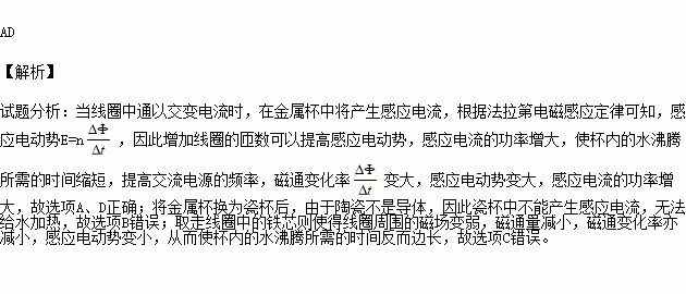 如图所示,在线圈上端放置一盛有冷水的金属杯,现接通交流电源,过了几分钟,杯内的水沸腾起来.若要缩短上述加热时间,下列措施可行的有( )