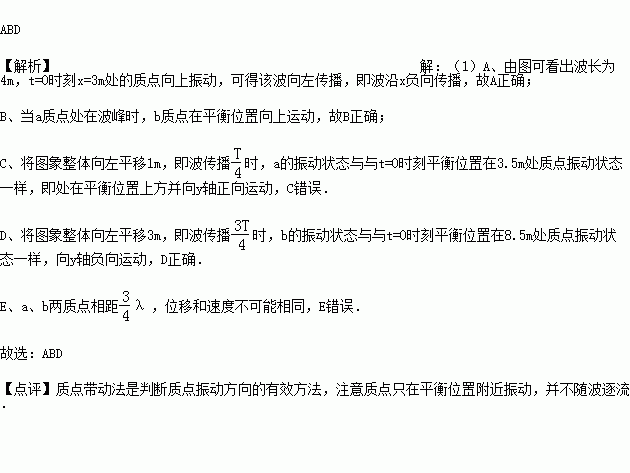 一列简谐横波沿x轴传播,周期为T,t=0时刻的波形如图所示.此时平衡位置位于x=3m处的质点正在向上运动,若a、b两质点平衡位置的坐标分别为xa=2.5m,xb=5.5m,则以下说法正确的是( )