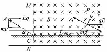 ÈçͼËùʾ£¬¿Õ¼ä´æÔÚˮƽÏòÓÒµÄÔÈÇ¿µç³¡£¬ÔÚÐéÏßMNµÄÓÒ²àÓд¹Ö±Ö½ÃæÏòÀ´Å¸ÐӦǿ¶ÈΪBµÄÔÈÇ¿´Å³¡£¬Ò»ÖÊÁ¿Îªm£®´øµçºÉÁ¿Îª+qµÄС¿ÅÁ£×ÔAµãÓɾ²Ö¹¿ªÊ¼Ô˶¯£¬¸ÕºÃÑØÖ±ÏßÔ˶¯ÖÁ¹â»¬¾øÔµµÄË®Æ½ÃæCµã£¬ÓëË®Æ½ÃæÅöײµÄ˲¼äС¿ÅÁ£µÄÊúÖ±·ÖËÙ¶ÈÁ¢¼´¼õΪÁ㣬¶øË®Æ½·ÖËٶȲ»±ä£¬Ð¡¿ÅÁ£Ô˶¯ÖÁD´¦¸ÕºÃÀë¿ªË®Æ½Ãæ£¬È»ºóÑØÍ¼Ê¾ÇúÏßDPÔ˶¯£¬ACÓëË®Æ½Ãæ¼Ð½Ç¦Á=30¡ã£¬ÖØÁ¦¼ÓËÙ¶ÈΪg£¬Çó£º