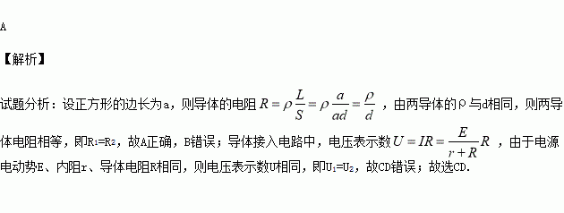 R1和 R2是材料相同,厚度相同,表面都为正方形的导体,但R1的尺寸比R2大得多,把它们分别连接在如图电路的A、B端,接R1时电压表的读数为U1,接R2时电压表的读数为U2 ,下列判断正确的是( )
