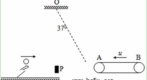如图所示,悬挂在高处O点的绳子下端是质量M=10kg的橡胶杆P,在游乐节目中,选手需要借助该装置飞越到对面的水平传送带上,传送带始终以u=3m/s的速度逆时针转动,传送带的另一端B点就是终点,且xAB=3m。一名质量m=50kg的选手脚穿轮滑鞋以水平向右大小为v0=8.4m/s的速度迅速抱住竖直静止的橡胶杆P并开始摆动,若选手可看作质点,悬点O到选手的距离L=6m,不考虑空气阻力,重力加速度g=10m/s2,sin370=0.6,cos370=0.8,求: